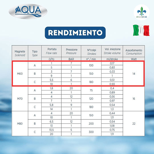 BOMBAS ELECTROMAGNÉTICA AQUA SERIE HC151+ CST Bomba electromagnética analógica, con ajuste de dosificación para mantener un caudal constante Existen tres modelos de series M60, M70 y M80. DESCRIPCION Ajuste de dosificación de caudal constante. Carcasa de PP reforzada, resistente a entornos de trabajo especialmente agresivos. Ajuste del porcentaje de frecuencia de carrera. Ajuste del caudal: 0-100 % o 0-20 %. Alimentación estándar: 100-240 V CA - 50/60 Hz. Grado de protección IP65. Montaje en pared con soporte de fijación incluido en el kit de instalación. FUNCIONALIDAD Caudal constante (unidad de medida expresada en %); Posibilidad de seleccionar el rendimiento deseado entre 3 modelos diferentes. BOMBA DOSIFICADORA ANALÓGICA ACCIONADA POR SOLENOIDE. Modo de dosificación constante. Carcasa de PP reforzada, adecuada para entornos de trabajo agresivos. Ajuste del porcentaje de frecuencia de carrera. Ajuste del caudal: 0-100 % o 0-20 %. Alimentación 220 V CA - 50/60 Hz; Grado de protección IP65; Soporte de montaje en pared incluido con el kit de instalación; MODO DE FUNCIONAMIENTO Caudal constante (caudal en %); 3 configuraciones de rendimiento seleccionables